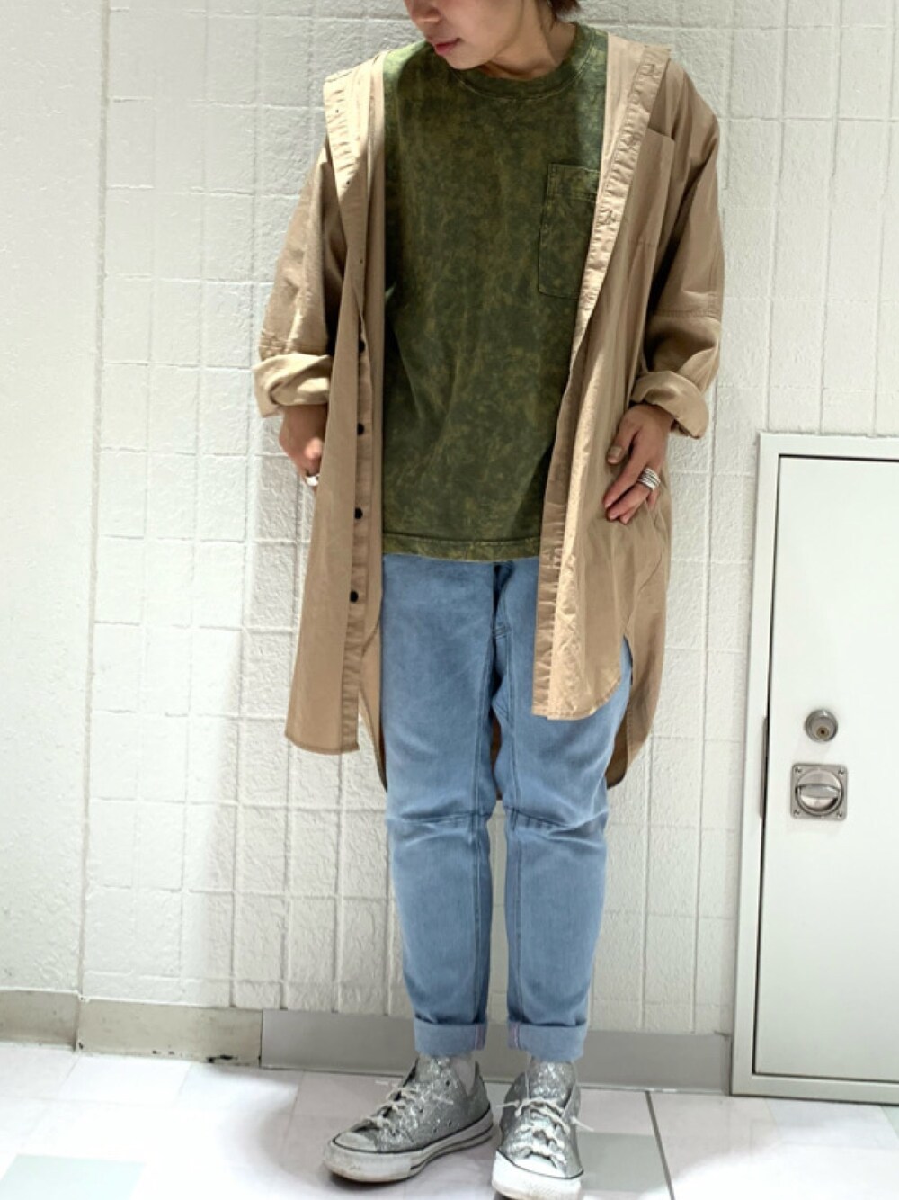 新作イチオシのダマスク柄で、バック刺繍シャツワンピースの登場です! 加工のTシャツでシンプル且つカジュアルにしてみました! パンツは、Mサイズ着用でゆるゆるっと着たくてこちらのサイズをチョイスしています! 伸縮性バツグンの今の時期にしかないイージーパンツです!!!! 身長153cm