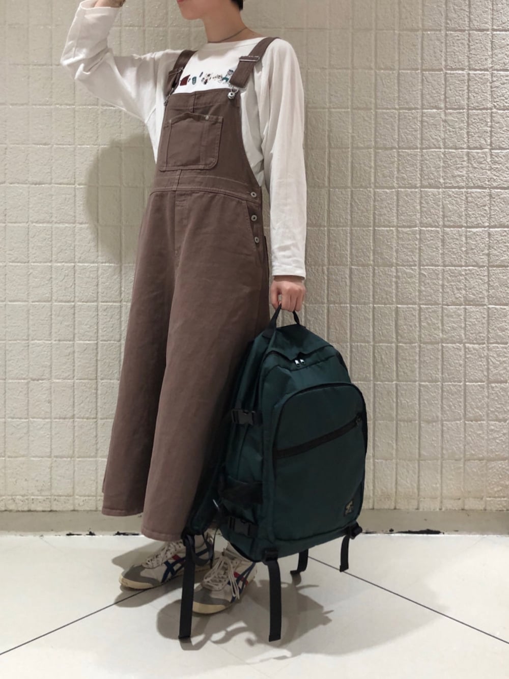 秋のお出かけにピッタリなジャンスカに、しりとりの刺繍が施されたロンTを合わせてみました!ジャンスカは長さの調節ができますし、オールシーズン使えるのでコーデの幅が広がるのでオススメですよ〜◎ 身長165cm