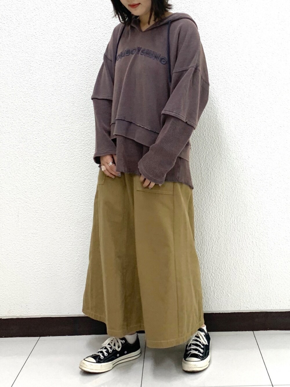 秋色コーデしてみました! 落ち着いた色合いでも暗くなりすぎず◎ レイヤード風のパーカーは1枚で決まる万能アイテムです! 加工感も古着っぽくて可愛いです〜♡ パンツ、スカートどのコーデにも合わせやすいですよ!