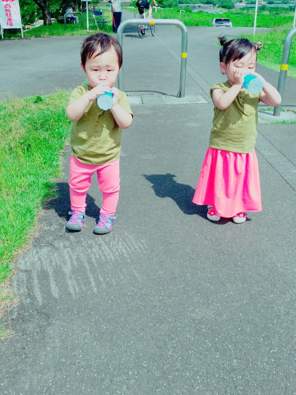 プールにいきました。 にいにのアイスを見て発狂してたのでジュースを買ってあげました…😵 とたんにご機嫌。 むすめちゃんにカーキのTシャツ、男子っぽいなあと袖をロールアップ。 とたんに女子らしい。