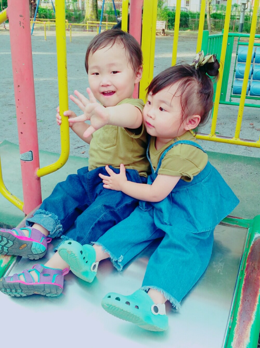 公園にきました。 高熱がでておりました息子さんもよくなりましたので✨ 動きやすいデニムで遊びましょう❤ 女子のTシャツはうでまくりしてかわいさを出しましょう❤ むすめちゃん、息子さんをぎゅー❤❤