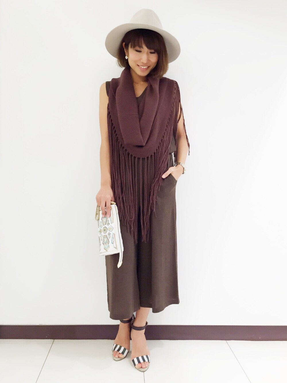 ワイドパンツシルエットのオールインワンに、ポイントとして、フリンジスヌードを。 フリンジスヌードをつけることで、縦長のラインが強調されて、シルエットがスリムにみえるこうかも◎