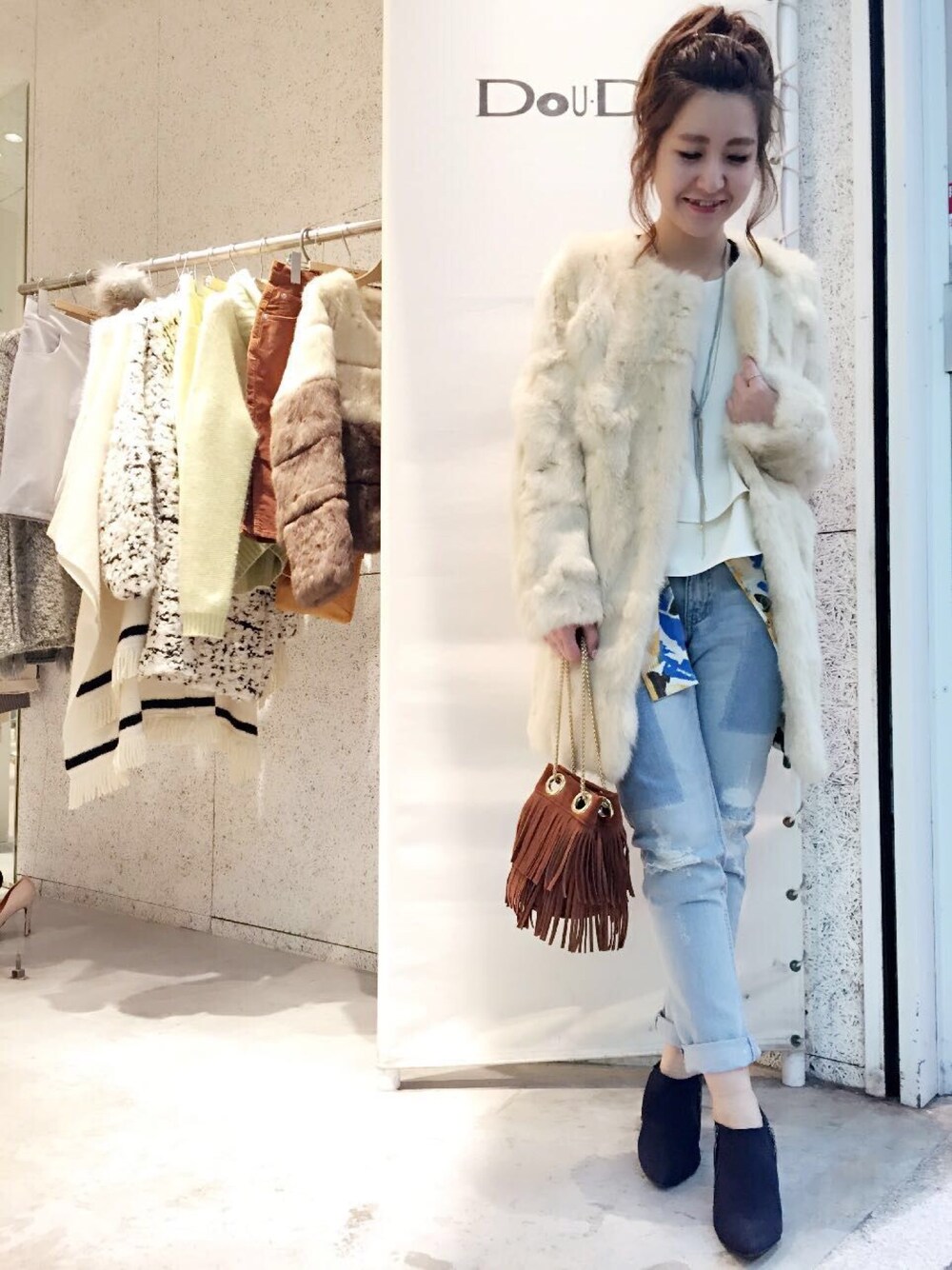 DouDou_STAFFのその他アウター「【DouDou】ラビットファーノーカラーコート」を使ったコーディネート