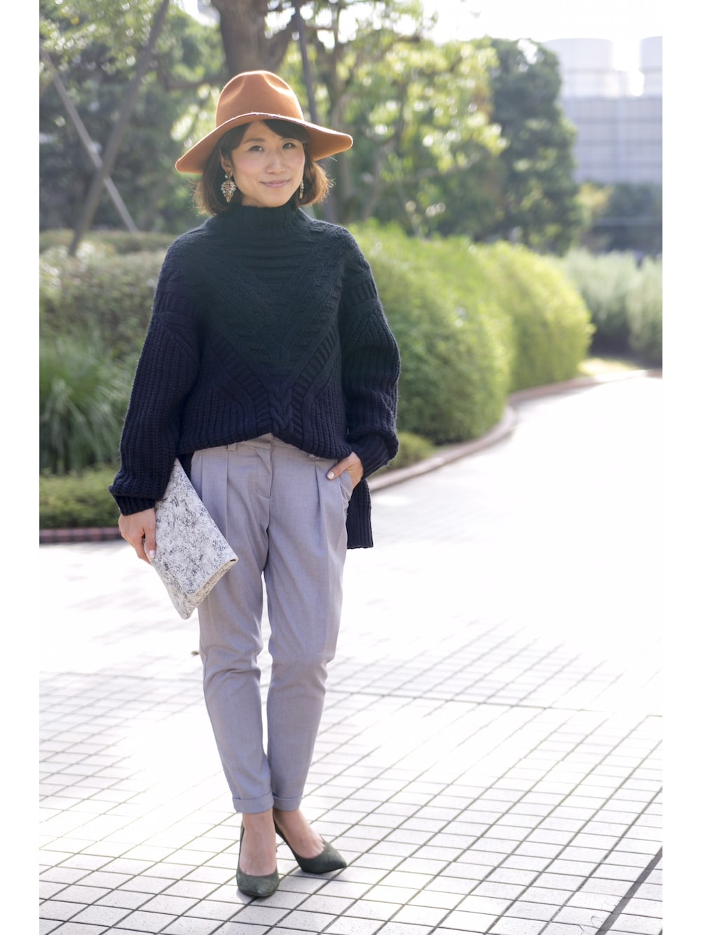ケーブル網のざっくりニット。シルエット抜群パンツとあわせて◎