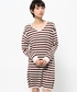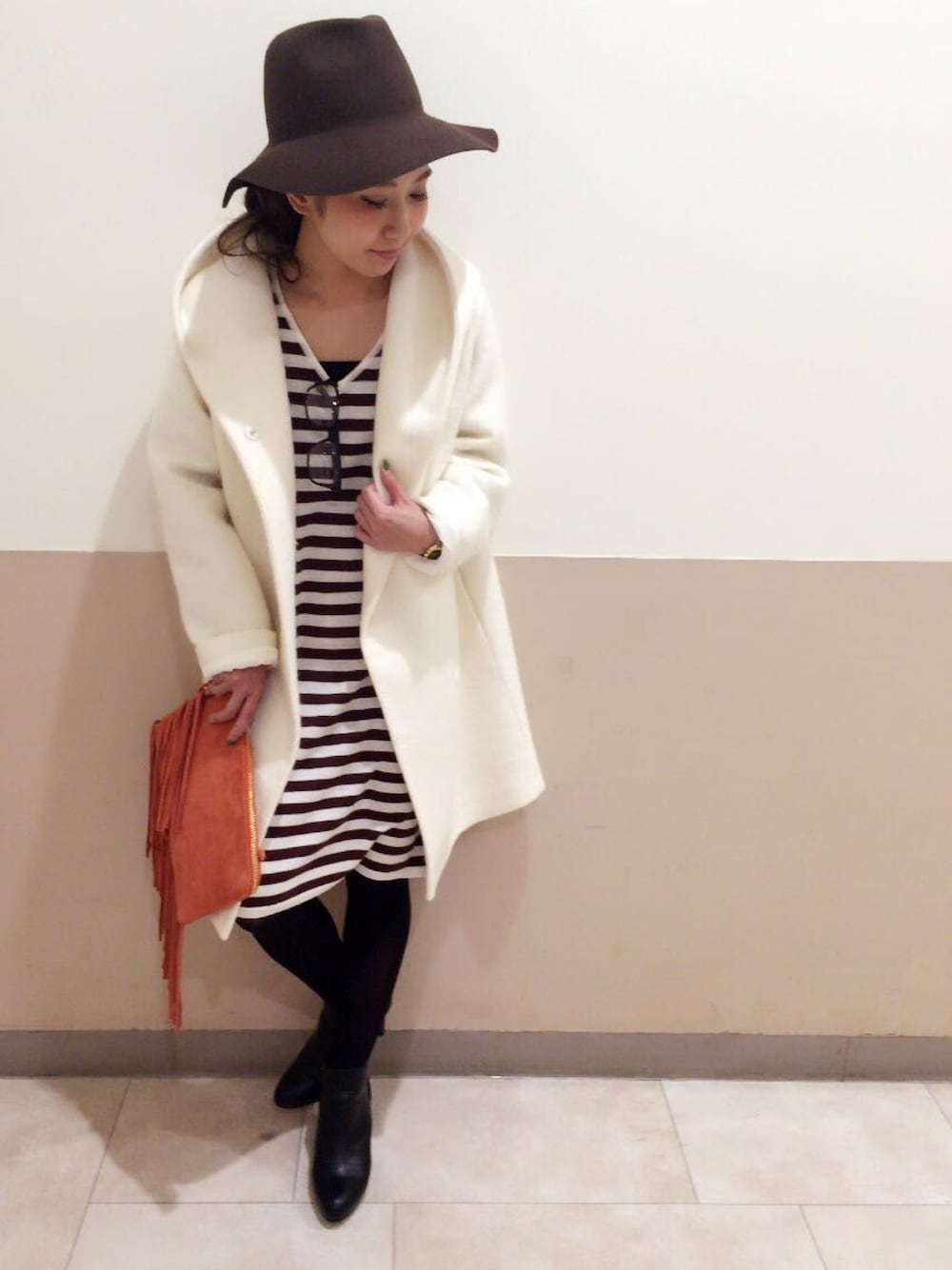 人気のフーデットコートをボーダーワンピースで合わせたシンプルコーデ。コートが主役の冬のスタイリングだから、お気に入りのコートを見つけたいですね!