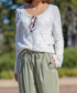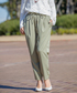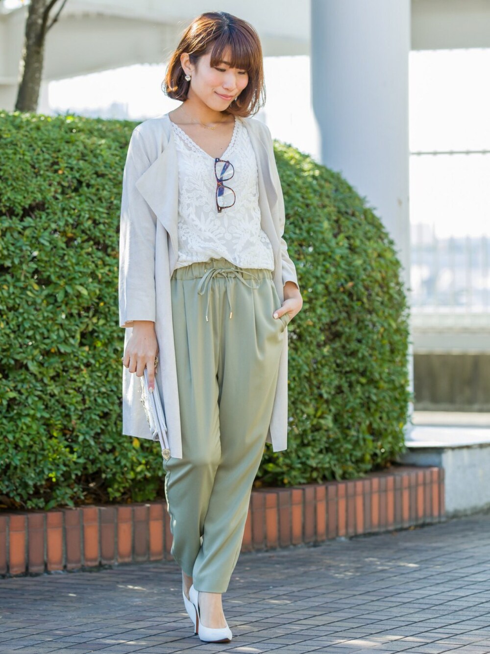新作のサテンイージーパンツは、カーキ色が春を感じさせてくれます。レースのブラウスとベージュコートで優しい雰囲気にしあげました◎