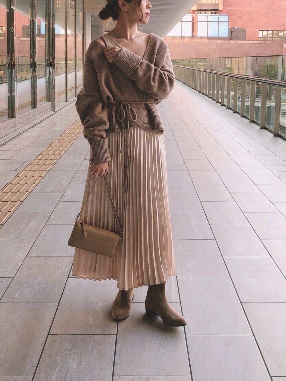 たまにはあわーいコーデも したくなります 流行りすたりなくきれる プリーツスカートは秋冬物の 定番◎ 紐ベルトのカーディガンは ウール入りでかなり暖かいですよ〜〜