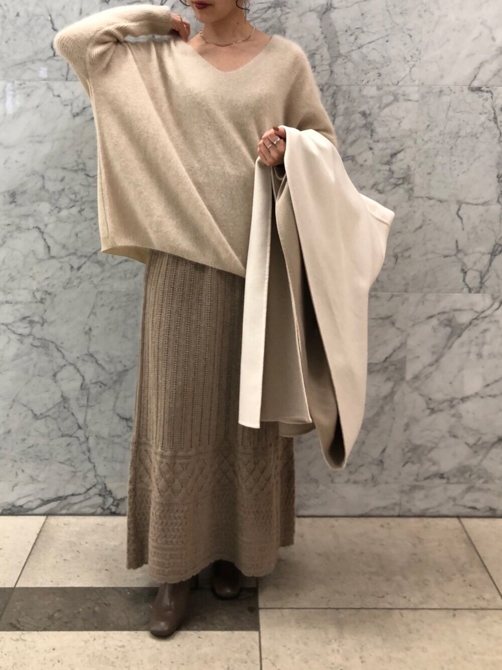 たぽっとしたふわふわの ニットに、長め丈のスカート合わせ〜 ベージュとオフホワイトの 淡い色合いがとっても好きです