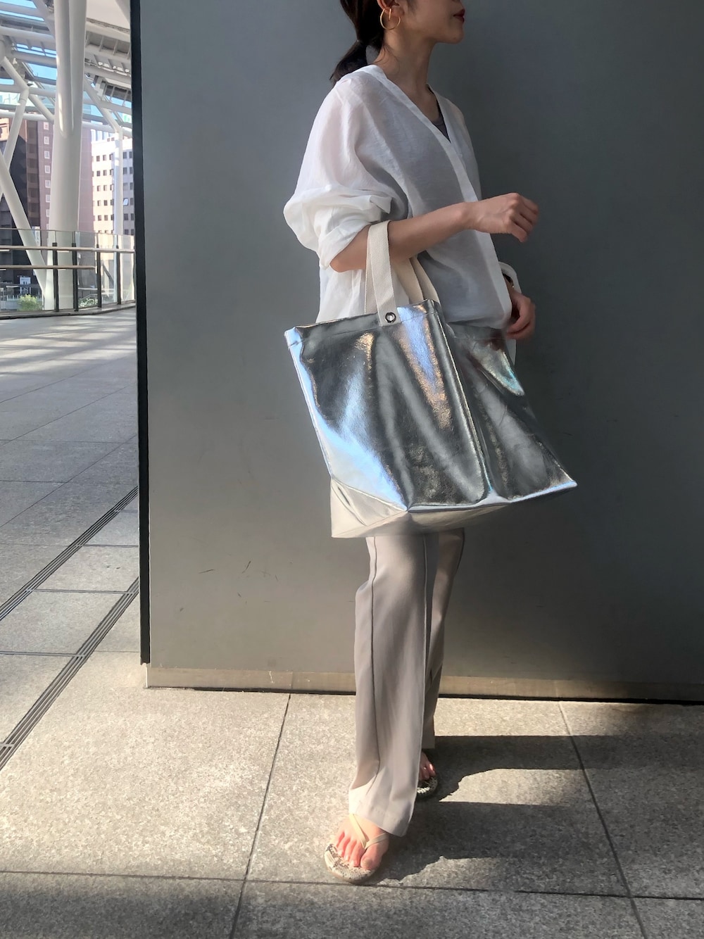 シアー素材のブラウスに 淡い色のパンツ合わせで ベーシックコーデ🤍🤍 シルバーのトートがアクセントになってます🌿