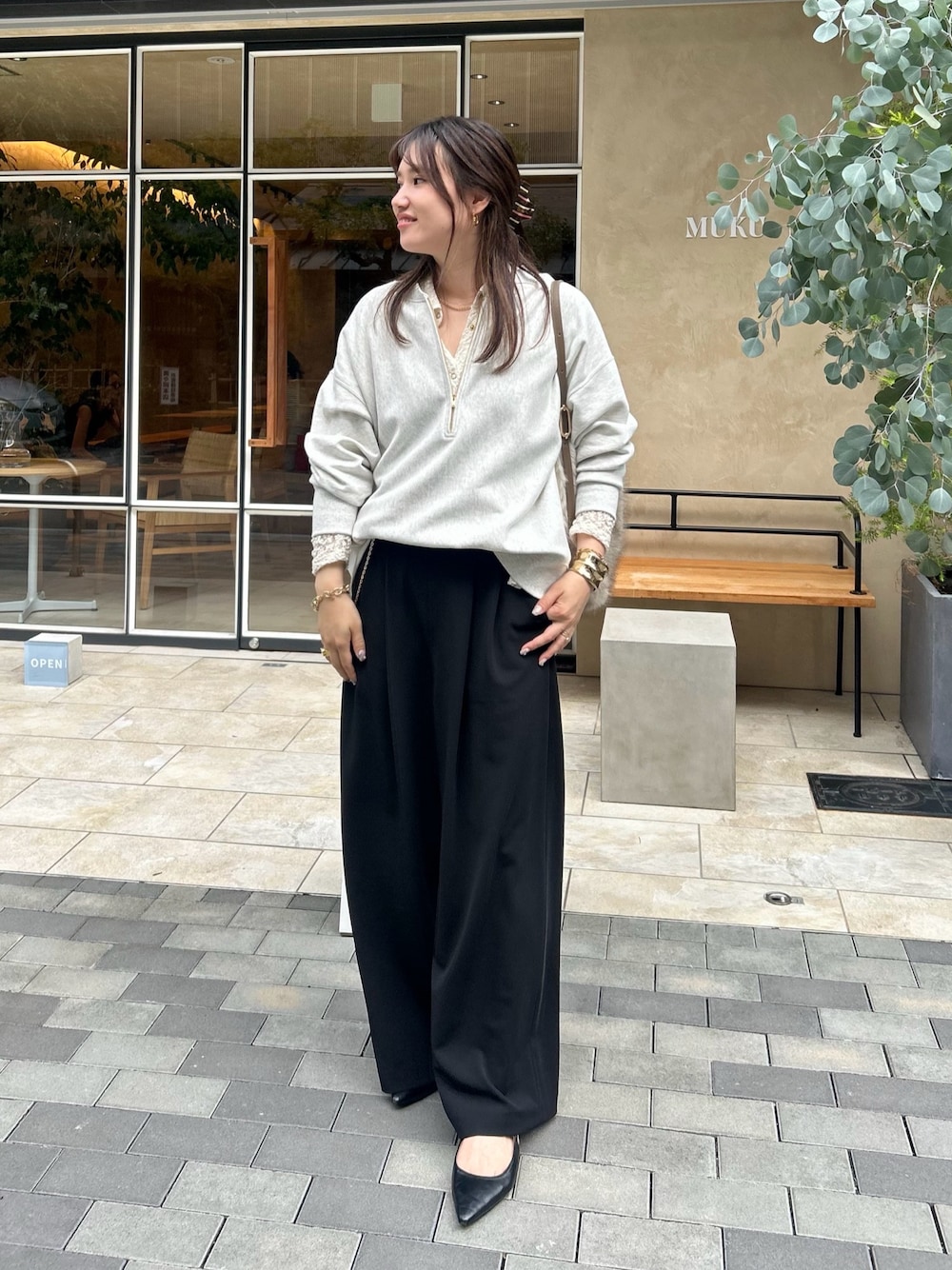 おこちさん企画スウェットと美シルエットパンツ合わせ✨ レースシャツを重ねて今年っぽく着てみました! パンツは美シルエットでとっても細見えしてくれました! オールゴムで着心地も抜群です◎ ぜひ参考にしていただけると嬉しいです☺︎