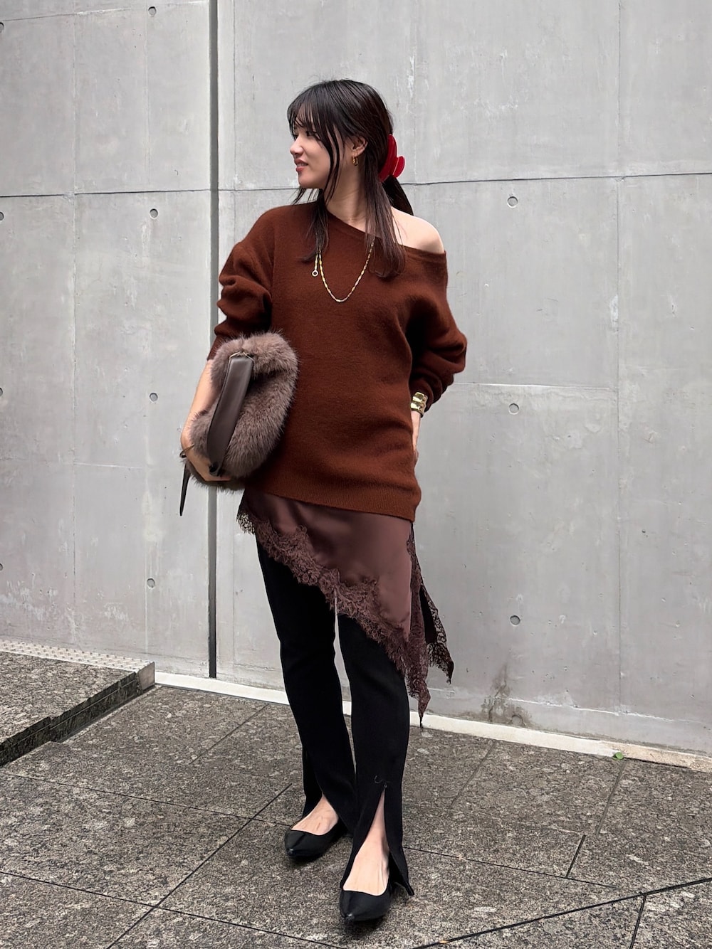 フォックスウールのふわふわニット🤎 ワンショルとして着ても可愛いです! 程よい抜け感が女性らしさも演出してくれます✨ パンツは誰でもスッキリ細見えしてくれるレギンスパンツ ファスナーの開け具合でも雰囲気を変えられます! ぜひ参考にしていただけると嬉しいです☺︎