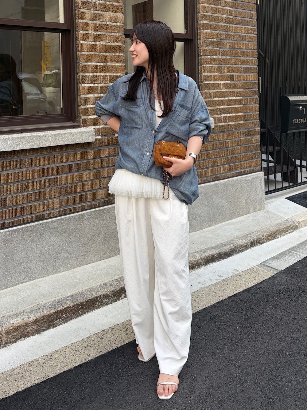 シアーデニムシャツにホワイトのインナーとパンツを合わせた春コーデ🌸 レイヤードスタイルが今年っぽくてお気に入りです♪ ぜひ参考にしていただけると嬉しいです☺︎