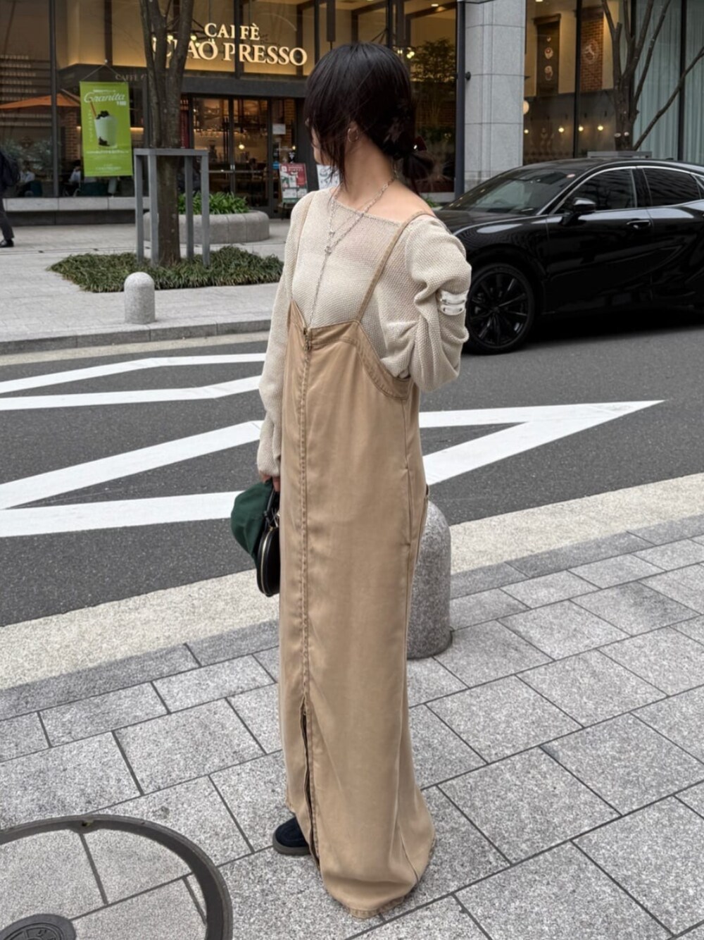珍しくベージュコーデをしてみました・・♡ 少し肩紐で調節して、ずるっと長めに着てみました! 軽く着られるので真夏も楽しめますし、裾にスリットも作れるので風通しも⚪︎ 鹿の子のニットもシャリ感があって、真夏も去年沢山着られましたよ!