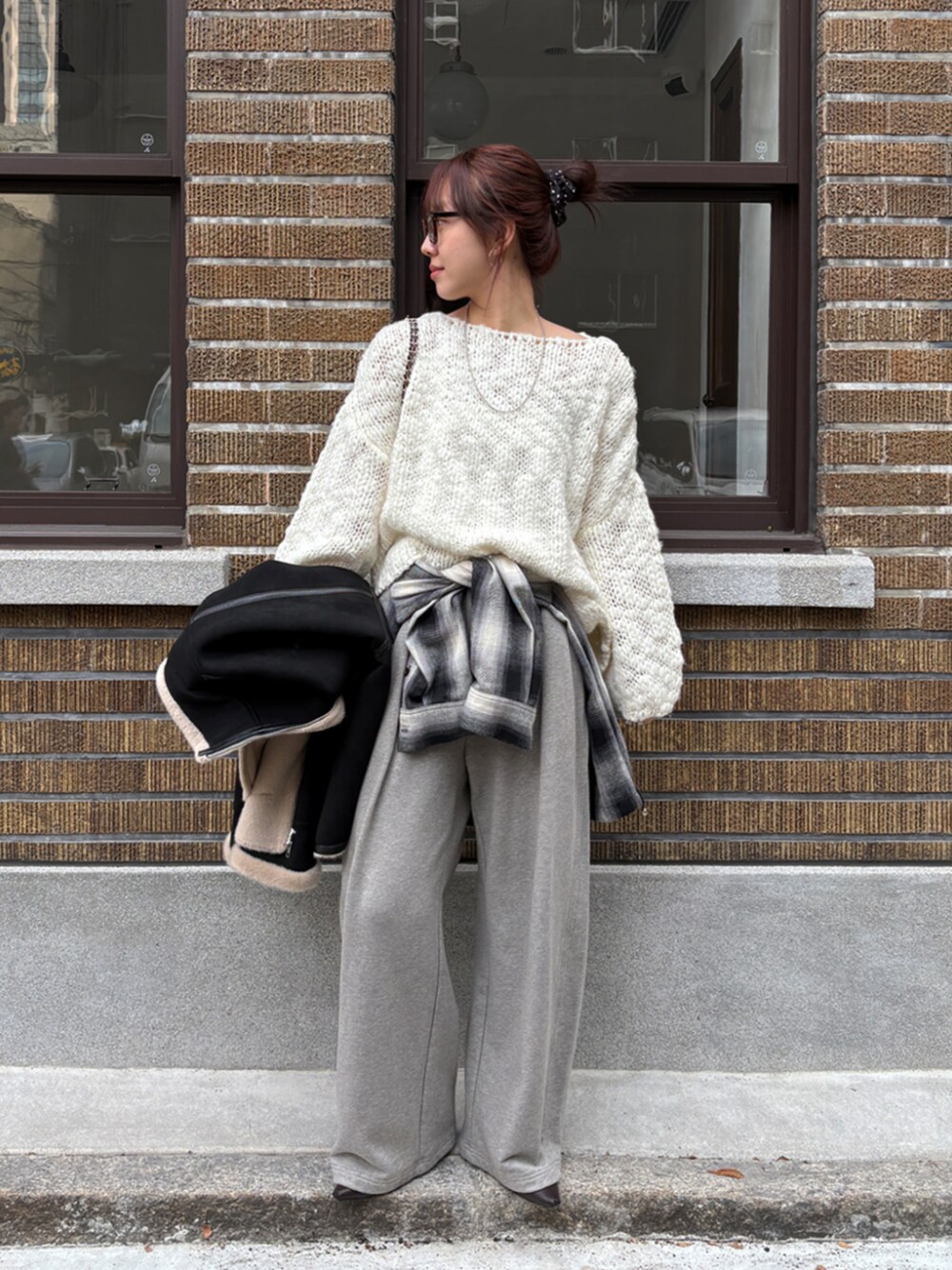 人気のローゲージニットを使ったコーデです♡ カジュアルに着たかったので、今回はスウェパンとコーデしてみましたー ^ ^ ゆるゆるだったので、バランスを取るために腰にはチェックシャツを巻いてワンポイントに。