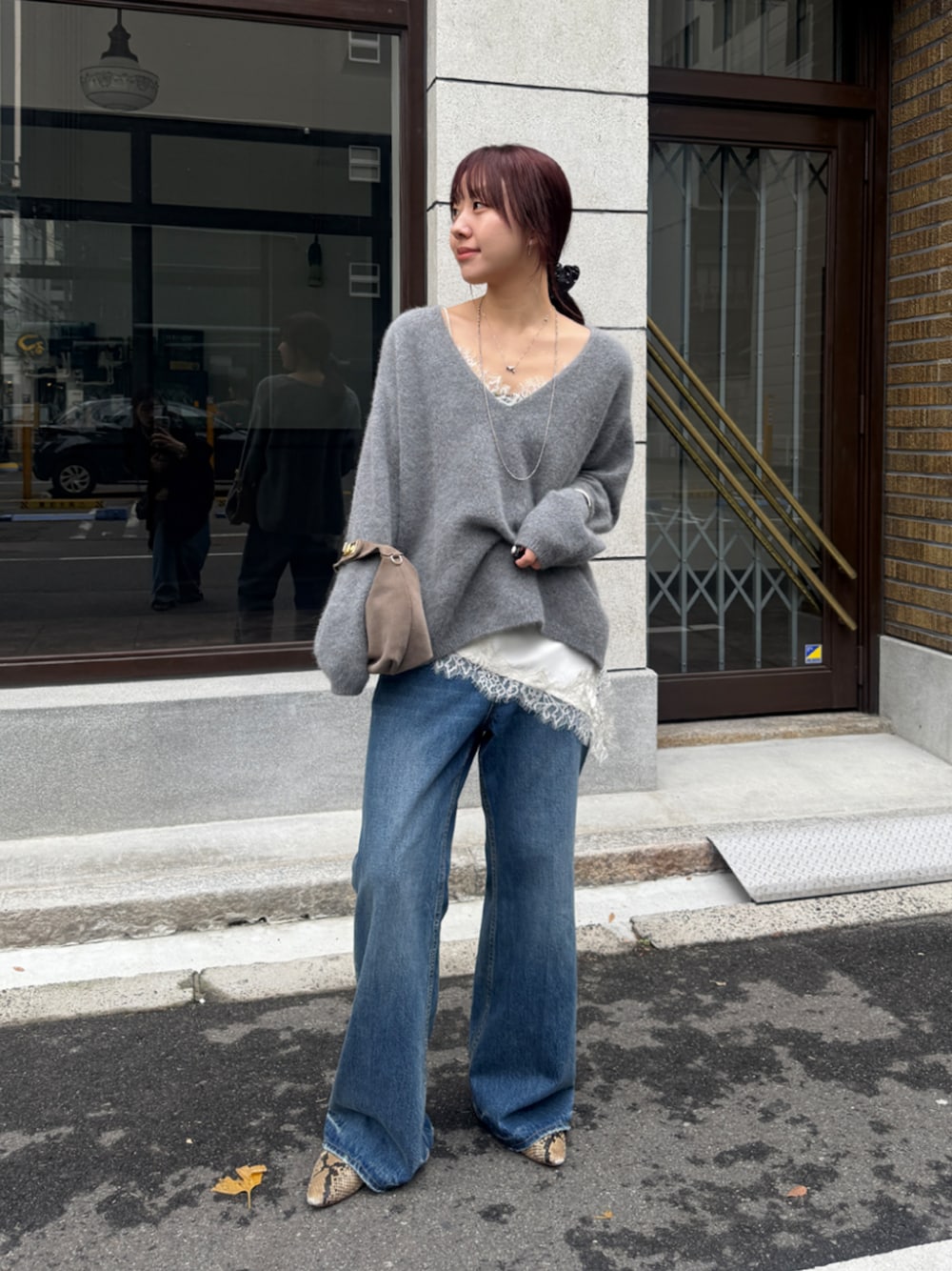 セールでお得にゲットできる深Vのあったかニットと、 アシメレースのキャミを主役に💙 ボトムはお気に入りのルーズフレアデニムです^^ 166cm で38のサイズを着用しています♩