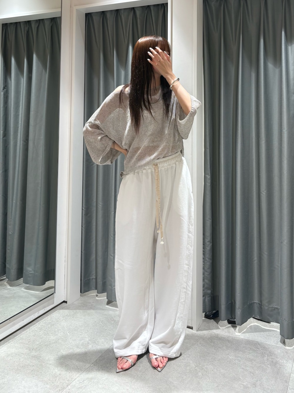 大胆なカーブシルエットのスウェパンは 部屋着っぽく見えずにキレイにはいていただけます♩ 軽くて涼しいメランジニットは着心地抜群💡