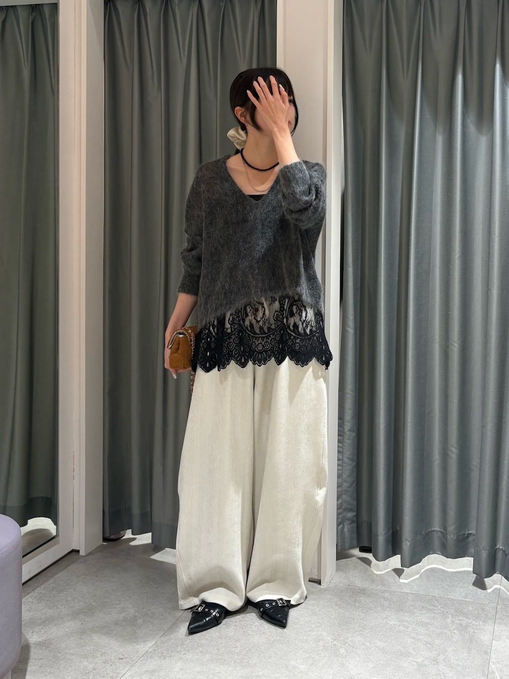 レースをレイヤードして カジュアルすぎない雰囲気にしてみました♡ コーデュロイ素材の楽チンパンツは 落ち感あるのできれいなシルエットで履いていただけます! TMサイズを着用しています^.^👍🏻💚