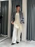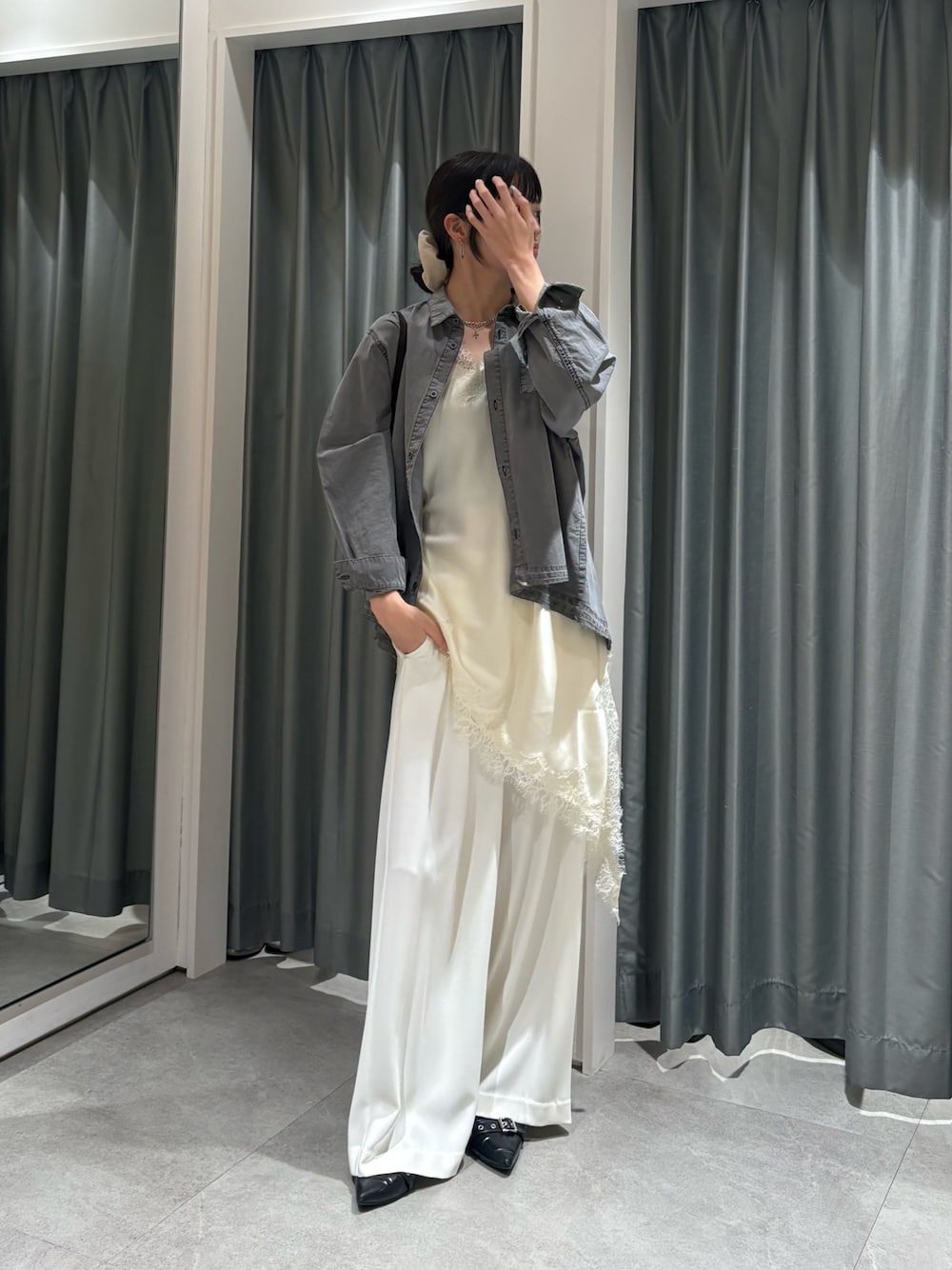オールホワイトにグレーのシャツを羽織って モノトーン派も挑戦しやすい春コーデ🌸