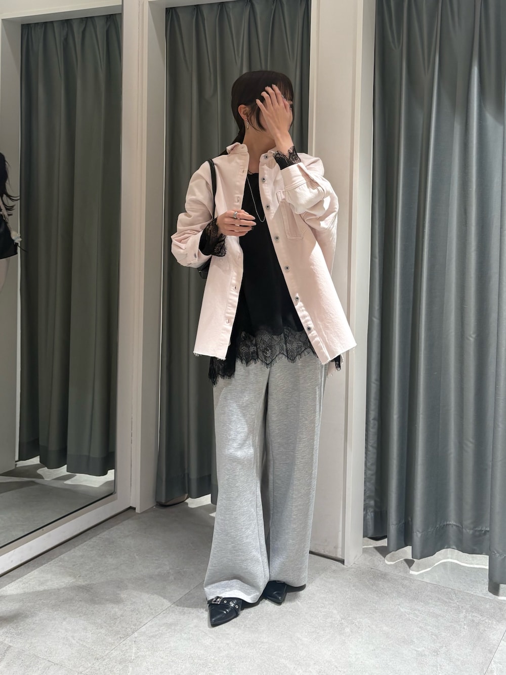 スウェットライクな履き心地ですが ハリ感あるお素材なのでオンオフ着まわしできる万能パンツ! 38サイズを着用しています。 人気のヘムレースロンTとも相性👍🏻❤️