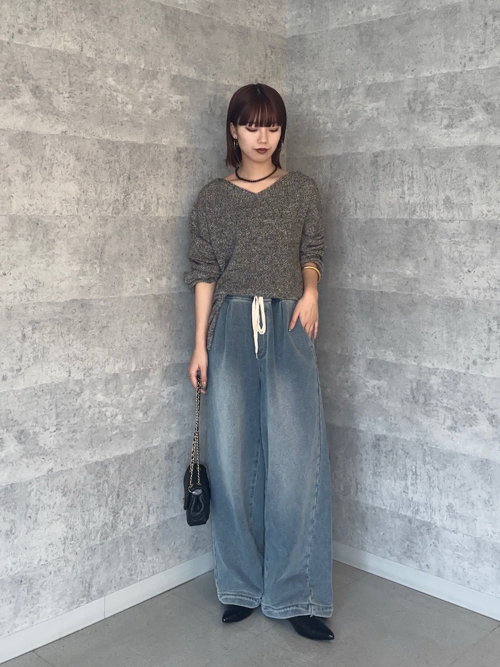 スウェットデニム合わせのカジュアルコーデ トップスは首元が広めになっていて スッキリとした印象になります! 腰回りもしっかりカバーしてくれる丈感です。 パンツは154cmで36サイズを着用しています。 デニムに見えるけどスウェットの素材で ウエストもゴムでストレスフリーです◎