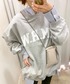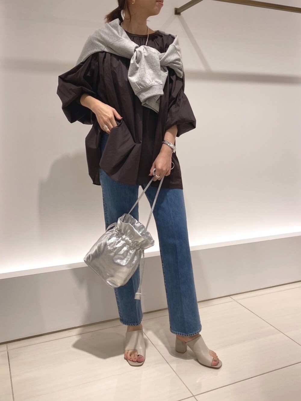 シャツ×デニムは飽きないシンプルコーデ♪ 今回は、肩がけした薄手ロゴスウェットをグレー、バッグは取り外しできるのでシルバーの巾着のみを使用、サンダルはライトグレーで小物類のカラーを合わせたのがポイント!!