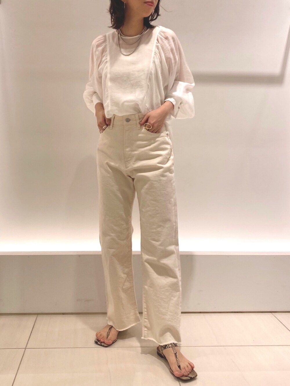 ワントーンコーデ○● web限定のシアーブラウスは肩周りのギャザーと袖口のボタンがポイント! シアー感が夏らしくて涼しげな印象♪ 柔らかいお素材なのでインスタイルでもふんわりシルエットが出て可愛いです! インナー次第で雰囲気が変わるのもいいですよね;)