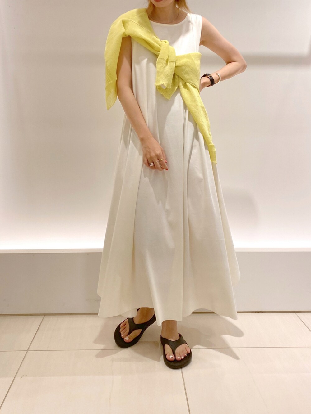 人気のボリュームフレアワンピース♪ ギマカーディガンを襷掛けにしてポイントにしてみました^^ 今回はビーサンで抜け感を出しましたが、 ヒールのあるサンダル合わせも女性らしくお出かけスタイルにオススメです!!