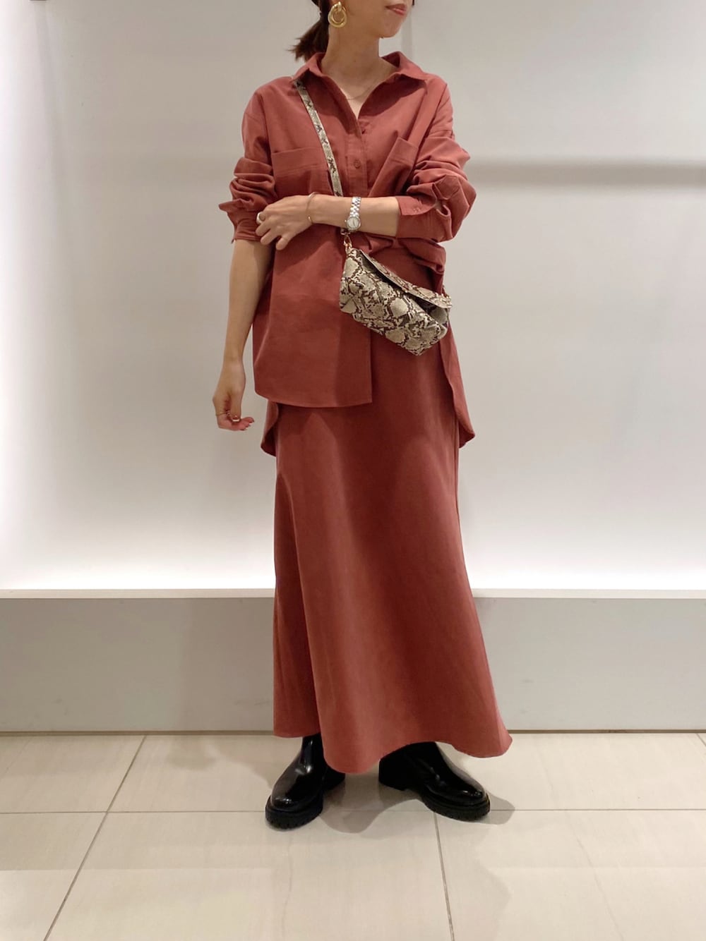 セットアップコーデ♪ 上下どちらとも着回し抜群◎ 首元、手首に抜け感をしっかり出して、 今の時期からでも着やすいように;) 足元も今季トレンドのブーツ合わせがオススメ!