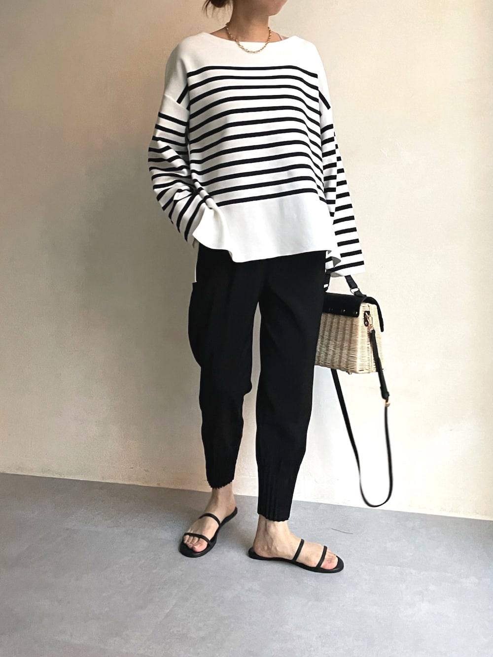 春に新鮮なモノトーンコーデ◎ トレンドのボーダーは春に着やすいさらっとした着心地のニット! 裾プリーツのパンツとメリハリコーデです♪ ———————————————————————— SNSも更新しています! チェックして下さると嬉しいです^^ Instagram >>> @doudou_minako