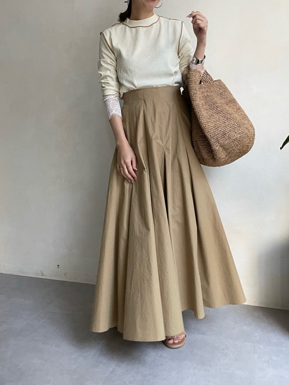 大人可愛いベージュコーデ♪ ハイウエストデザインのスカートに 袖口レースのトップスをイン! メリハリコーデおすすめです^^ ———————————————————————— SNSも更新しています! チェックして下さると嬉しいです^^ Instagram >>> @doudou_minako