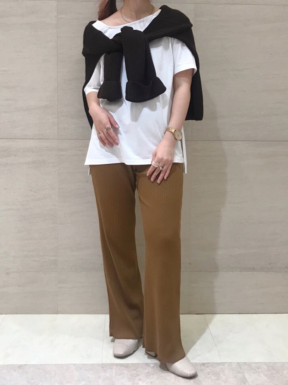 今からでも出来る秋っぽコーデ🍁 Tシャツに薄手のニットを肩がけ!! ブラウン系の色味を使って秋っぽく☆ instagram/@doudou_riko