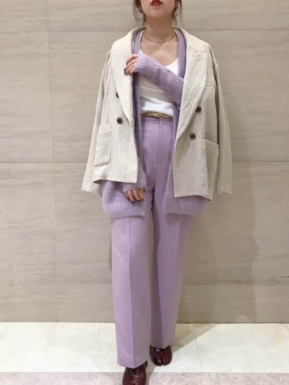 ラベンダーコーデ⚪️ 可愛くなりすぎないように ジャケットを羽織ったのがポイントです!! instagram/@doudou_riko