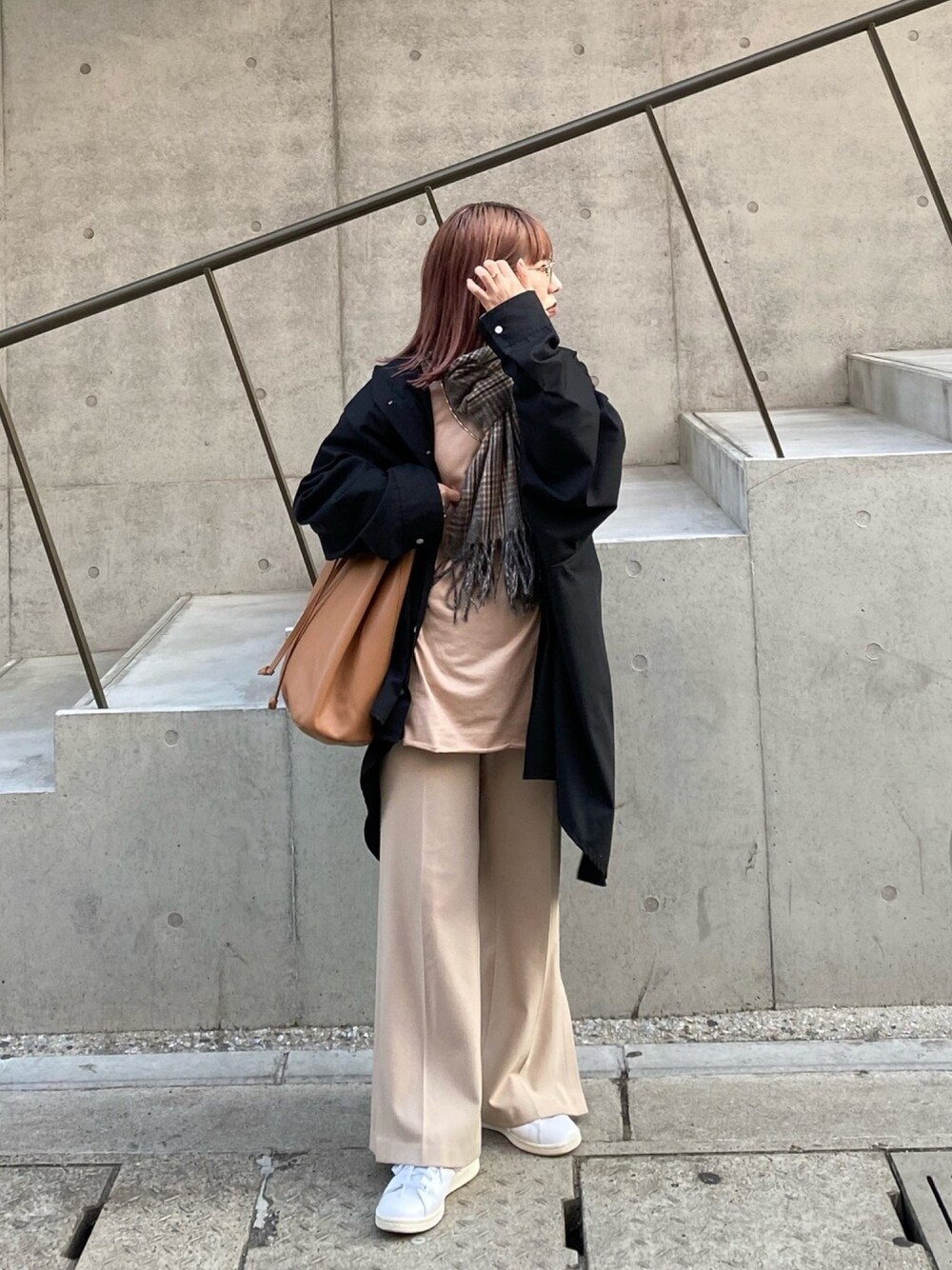 休日コーデ🍑🍑🍑 ブラックのアウターのインナーは、 淡色ワントーンコーデ🍑🍑🍑 チェックのマフラー、プチプラでお気に入り🧣 instagram/@doudou_riko