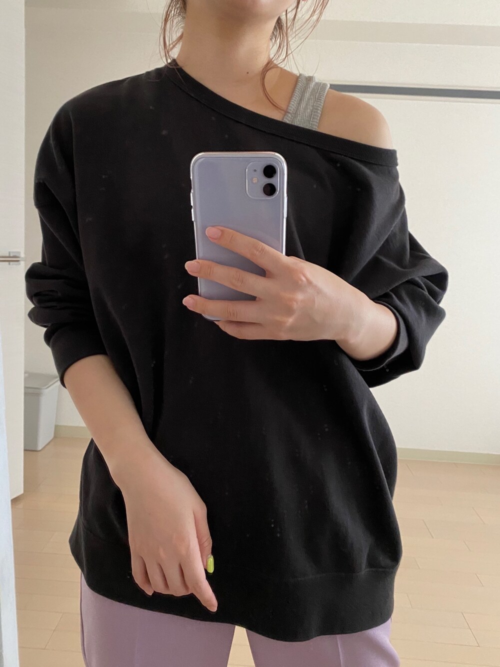 スウェットの片方を落として ぬけ感を出したよ😍‼️‼️ とっても楽ちんコーデ🧡 instagram/@doudou_riko