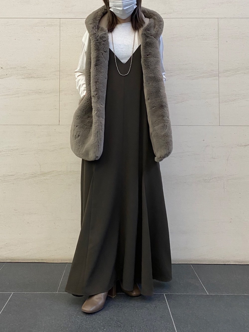 ブラウンコーデ🌰🌰🍁🍠 エコファーベストがとんでもなく気持ちいいの🥺❤️❤️ キャミワンピースとの組み合わせも可愛い! ワントーンで揃えたのと、秋にファーを取り入れるスタイリングがポイント! instagram/@doudou_riko