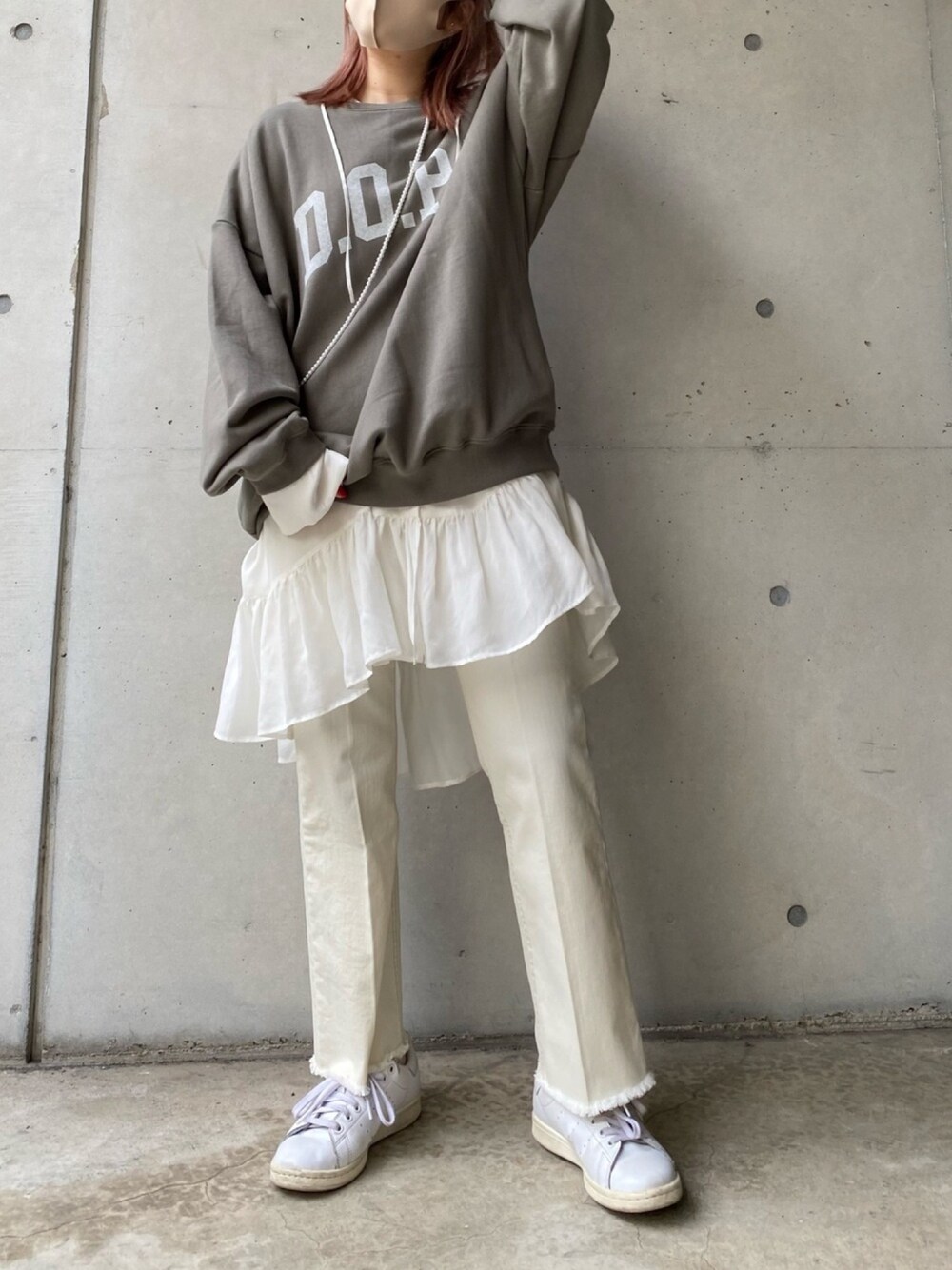 オススメこーで💞👄💞👄💞👄 ロゴスウェットかわいすぎる🥺❤️ 普段フリルなんて着ないけど こんな着方したらかわいいぢゃん‼️💯 デニムとスニーカーでラフさをだしたよ! instagram/@doudou_riko