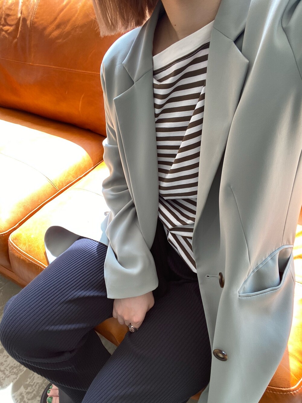 出勤コーデ✌🏻🦓❤️❤️ カーキのボーダーかわいいし、 グリーンのおさがりジャケットがとっても春らしくて最高🌸🌸🌸 instagram/@doudou_riko
