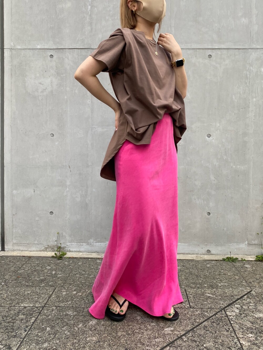 お目立ちスタイル💞💞 ちょーピンクのスカートに モカのTシャツ合わせに。 柔らかいモカを合わせることによって ピンクが調和されておしゃれにみえるよう! instagram/@doudou_riko