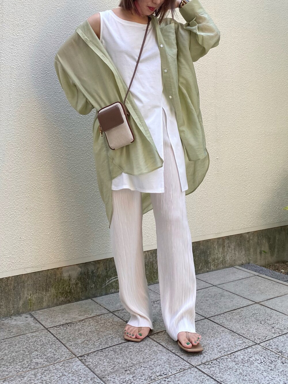 シアーシャツ💚💚 ホワイトワントーンにグリーンを合わせてさわやかスタイルに。 ブラウンバッグを差し色に! instagram/@doudou_riko