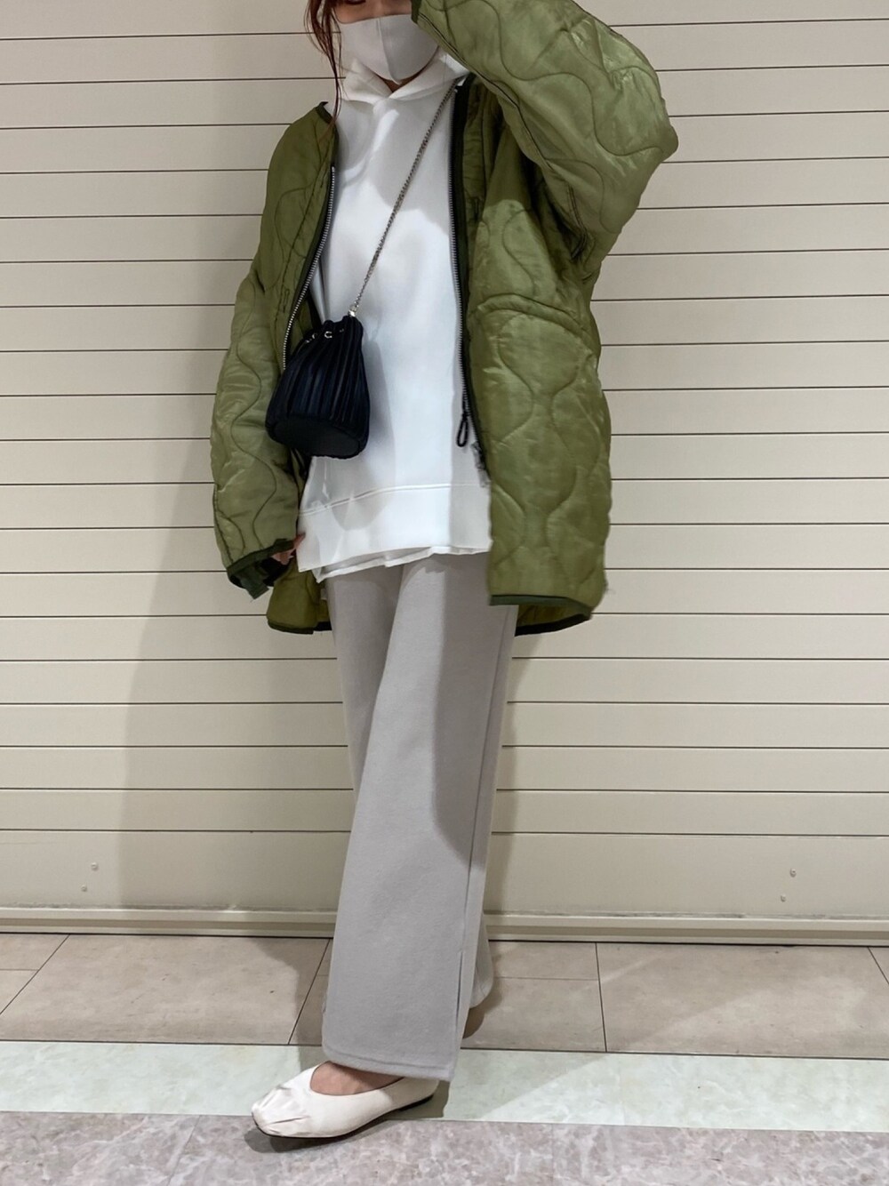 楽〜なコーデ🤍 パーカーがトレンドのダンボール素材で、 カジュアル過ぎずにきれます。 真っ白かわいい☁️