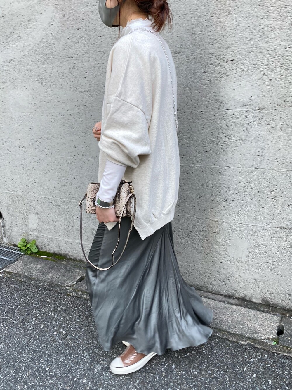 スウェットコーデ👟 カジュアルすぎないよう、光沢感のあるスカートを合わせました〜🍃