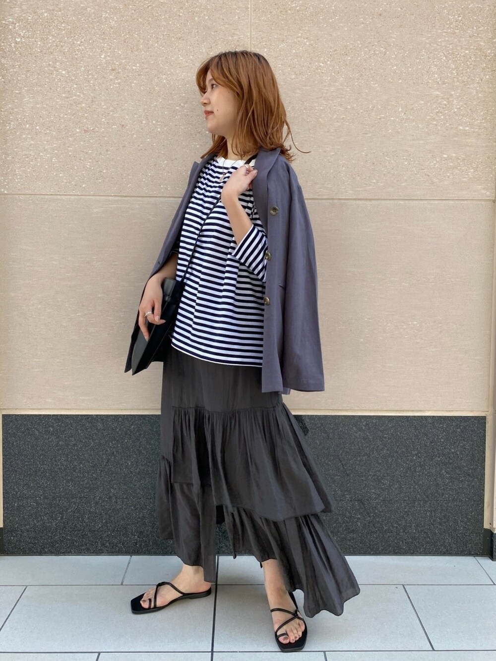 昨日のセットアップのコーデから、 ボトムをスカートにして雰囲気を変えて着回しました。 カジュアルになりやすいボーダーも、 スカートと合わせると女性らしく着れます💃