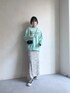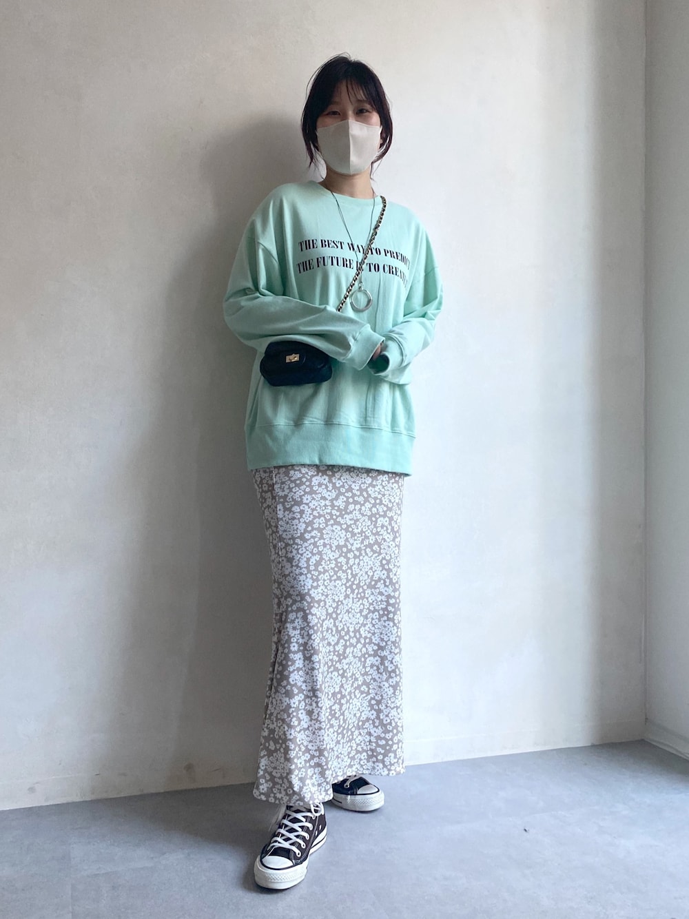 前後どちらが前でも着れるロゴスウェットと かなりストレッチの効いた素材のスカートコーデ🌼 グレージュとミントの組み合わせが爽やかで 気分が上がります!