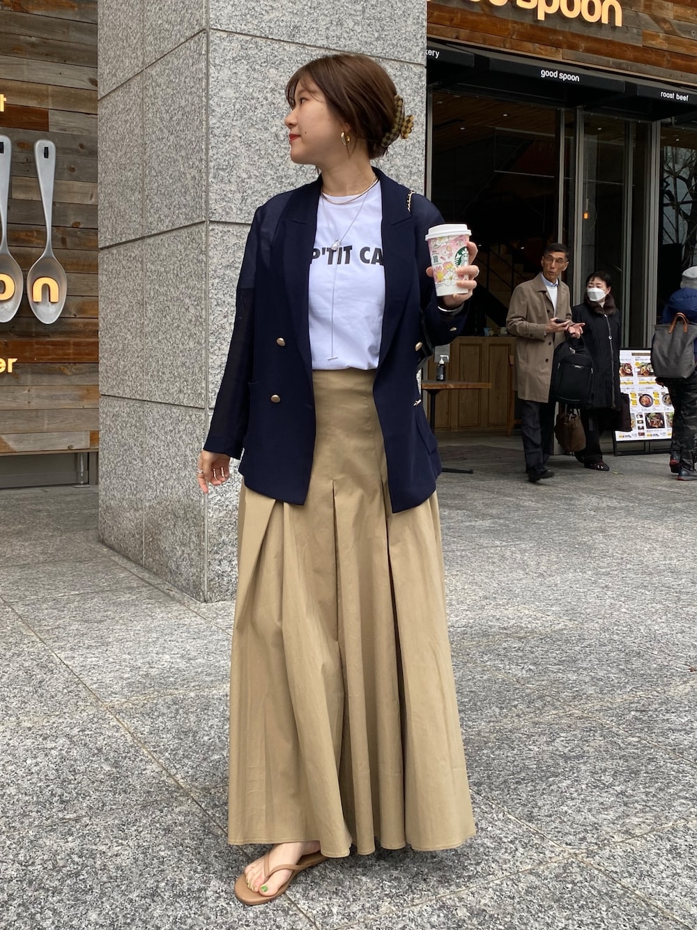 フレアだけど腰回りは広がらない シルエットの綺麗なスカートに、 高身長さんにもおすすめしたい 長めな丈のスカートです。 元々腰回りの広がりにくいデザインなのですが、 さらにすっきり見えるよう、 気になる腰回りやお尻もお洒落にカバーしてくれる ジャケットあわせで、さらに細見え! ロゴTは博多店リニューアルオープンのノベルティを着用しています。 ロゴが少し違いますが、形は一緒の ロゴTをタグ付けしております◎ _______________________ [ジャケット]color: ネイビーsize:フリー [スカート]color:ベージュsize:フリー [インナー]color:オフsize:フリー [バッグ・ネックレス]color:シルバー _______________________ いつもご覧頂きありがとうございます! 他のSNSも日々投稿をしているので ぜひそちらも見ていただけると嬉しいです◎ insta@___saku14_ WEAR@doudousakura TikTok@doudousakura