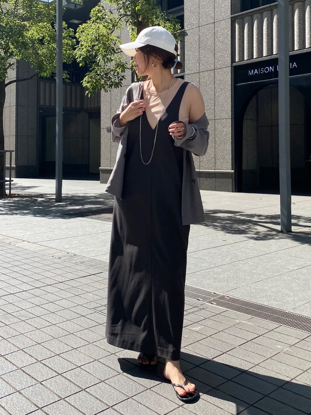楽ちんなのに綺麗目見えするジャンスカ。 Vネックが深く開きすぎると胸元が気になるので 少し深い方を後ろにして着用しました◎ まだ日中暑いので、今お得になっているタンクが大活躍しそうです。 タンクは、冬になったらニットの中に着て、 首元からチラ見せもおすすめなスタイリング。 _______________________ [タンク]color: ピンクsize:フリー [ジャンスカ]color: チャコールsize:フリー [ジャケット]color:グレーsize:フリー [バッグ]color:シルバー