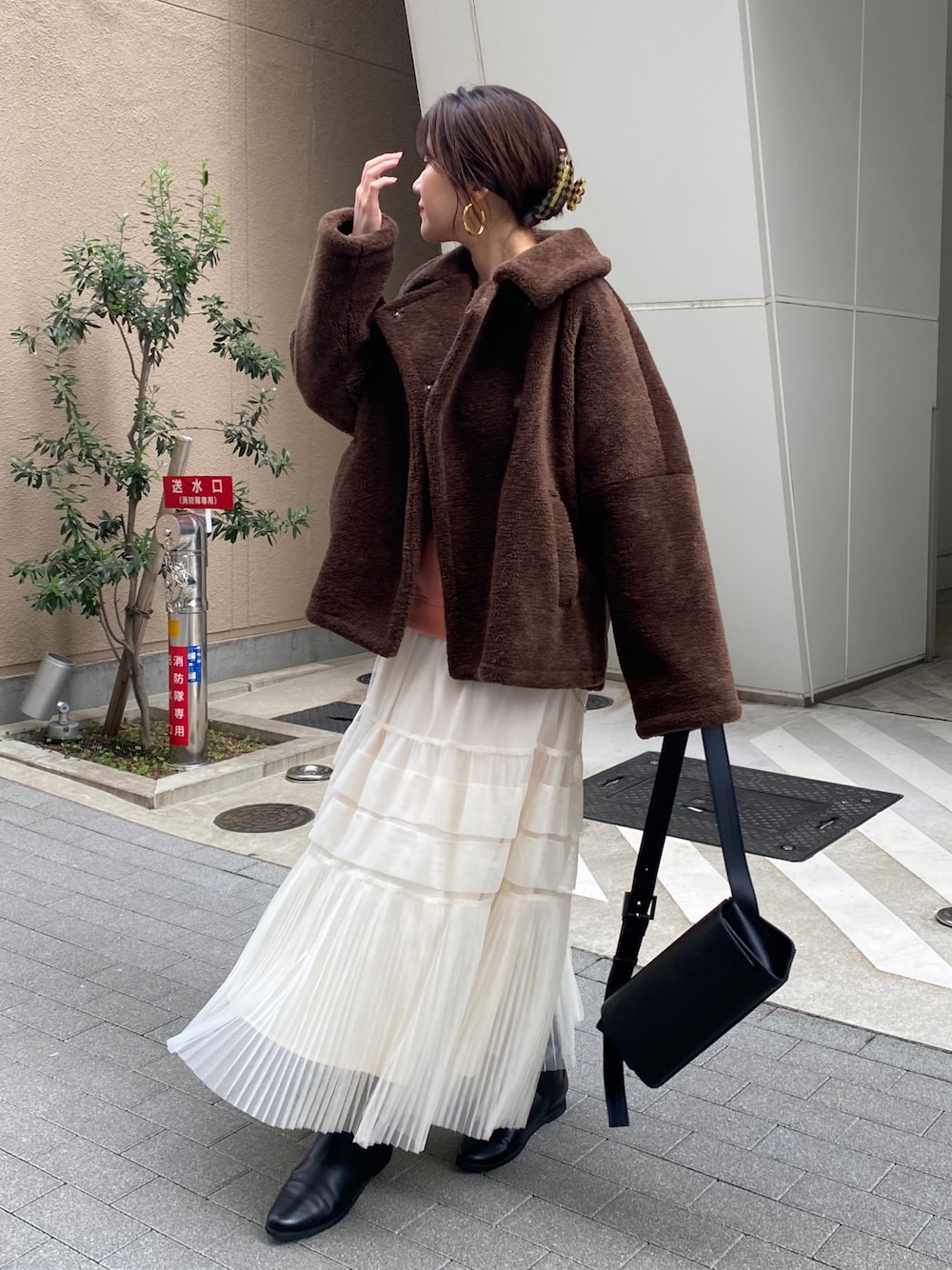 冬のお出かけにおすすめなコーデ! スウェットの新色オレンジを着てみました。 柔らかい色合いで着やすかったです! スウェットに華やかさをプラスしたかったので インナーにラメ、コートはボアを選びました◎ ボアのボリュームをすっきり見せたかったので、 透け感のあるスカートをあわせましたー! _______________________ [スウェット]color: オレンジsize:フリー [スカート]color: オフsize:フリー [インナー]color:ゴールドsize:フリー [バッグ]color:ブラック [コート]color:ブラウン ________________________ いつもご覧頂きありがとうございます! 他のSNSも日々投稿をしているので ぜひそちらも見ていただけると嬉しいです◎ insta@___saku14_ WEAR@doudousakura TikTok@doudousakura