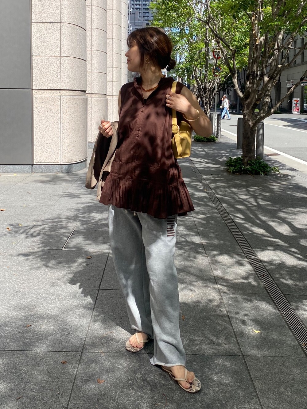 裾のプリーツデザインがかわいいブラウス。 長さがあってお尻まで隠れるので パンツとの合わせがバランス良く着やすかったです。 少し細身のパンツだと、スタイルアップして着やすいのでおすすめです! なので今回は人気のドロストスウェットではなく、 ロゴ入りのタイプのワイド感の少ないスウェットパンツで合わせてみました。 ジャケットで二の腕もカバーしたスタイリングに。 _______________________ [ブラウス]color: ブラウンsize:フリー [パンツ]color: グレーsize:TM [ジャケット]color:モカsize:フリー [バッグ]color:イエロー coming soon ________________________ いつもご覧頂きありがとうございます! 他のSNSも日々投稿をしているので ぜひそちらも見ていただけると嬉しいです◎ insta@___saku14_ WEAR@doudousakura TikTok@doudousakura