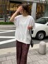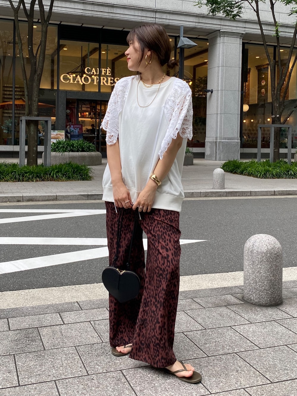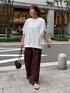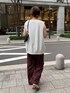 落ち着いたバーガンディの色合いで、 レオパード柄が浮かないので 普段履き慣れてない柄物でしたが意外としっくり着られました◎ 涼しい薄手素材のレオパードなので トップスは程よく生地に厚みがあって、体型カバーもできるスウェットタンクに。 上半身がシンプルで、二の腕も気になったのでレースボレロをあわせました。 パンツとの距離があるので レースにレオパードをあわせたスタイリングでも、まとまりが出て可愛かったです。 _______________________ [スウェット]color: オフsize:フリー [パンツ]color: バーガンディsize:フリー [ボレロ]color:オフsize:フリー [バッグ]color:ブラック ________________________