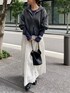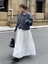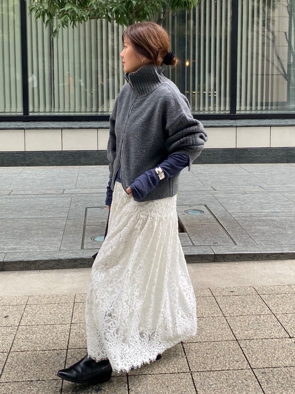 人気のジップニット。 少し丈が短く感じたので、シアーのロンTをレイヤードしました! 少し広がりのあるスカートなので下半身カバーできます◎