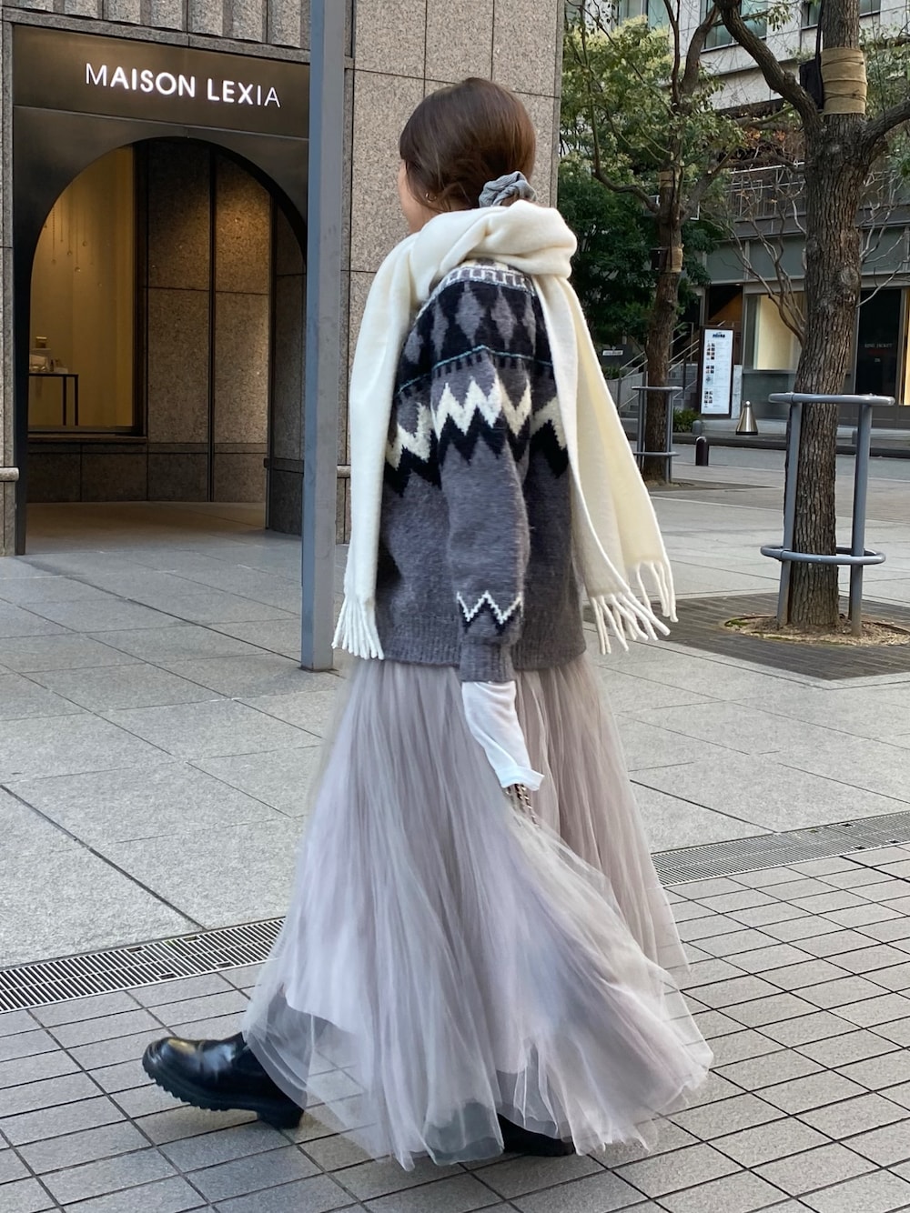ノルディック柄の色を拾った ワントーンコーデ! グレーの差し色に、コットンシアーのインナーは水色にしました♩